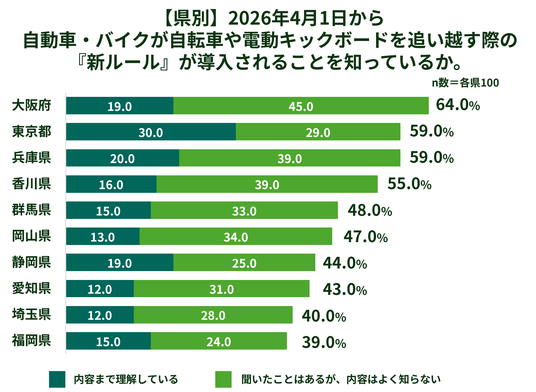 また、自動車やバイクが自転車・電動キックボードを追い越す際、十分な側方間隔を保つことを求める新ルールについては、認知が49.8%、内容理解は17.1%と低い理解率でした。