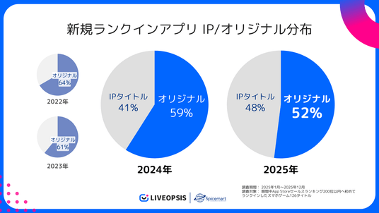本調査では、2025年新規ランクインタイトルのうちオリジナル作品にあたる「非IP」タイトルは52%と過半数を占める結果となりました。