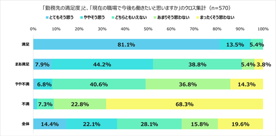 ※「勤務先の満足度」は縦軸(「満足」等)で掲示、「現在の職場で今後も働きたいと思いますか」は「とてもそう思う」等のパーセンテージで掲示