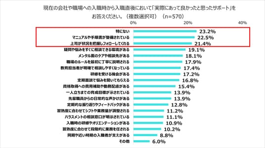 ・入職直後の「あって良かったサポート」の上位は「マニュアルや手順書が整備されている(22.5%)」、「上司が状況を把握しフォローしてくれる(21.4%)」など