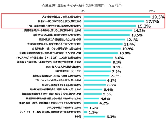 1、介護従事者が介護業界に興味を持ったきっかけの1位は「人や社会の役に立つ仕事だと思ったから(19.5%)」