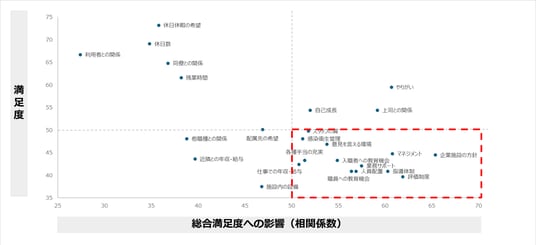 「企業施設の方針」、「評価制度」、「管理職のマネジメント」、「指導体制」については満足度が低く、総合満足度への影響は大きいため、重点的に改善すべき項目であることがわかった。