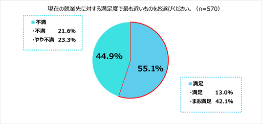 満足している層が多いものの、「まあ満足(42.1%)」が多く、「満足(13.0%)」と回答した人は、不満系である「不満(21.6%)」や「やや不満(23.3%)」を下回る結果となった。