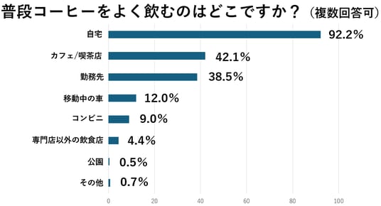 コーヒーをよく飲む場所については、やはり自宅で飲む人は多く92.2%。他の場所では、カフェや喫茶店が42.1%、勤務先が38.5%といった回答が多く、テイクアウトして公園で飲む、といった人は0.5%と案外少なく、屋内でコーヒーを楽しんでいる人が多い傾向でした。