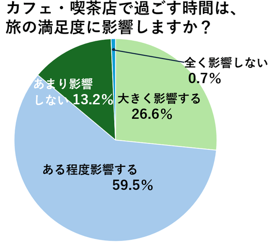 多くの人が旅先でのコーヒーを楽しんでいることが分かりましたが、カフェや喫茶店で過ごす時間が旅の満足度に影響するかどうかも聞いてみました。有効回答のうち大きく影響すると考える人は26.6%、ある程度は影響すると考える人は59.5%でした。合わせて86.1%の人が旅行先での癒やしのコーヒータイムが旅の満足度を向上させる要素だと認識していることが分かりました。