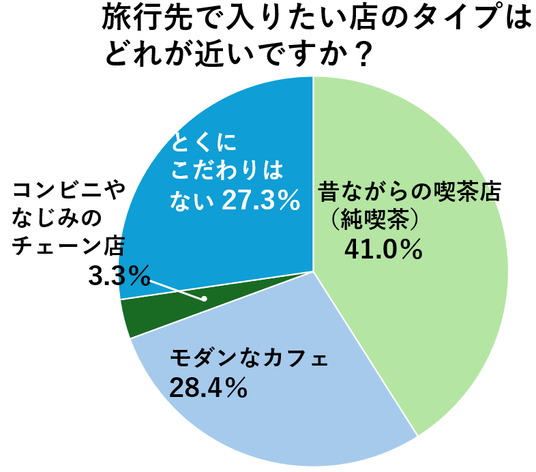 旅先でもコーヒー店でコーヒーを飲むという人に、入りたいコーヒー店のタイプを伺うと、41.0%の人が昔ながらの喫茶店と回答。次いで多かったのがモダンなカフェで28.4%。こだわりはないという人も27.3%いますが、多くの人は旅にでかけたなら、その土地ならではのコーヒー店を好んで訪れているようです。