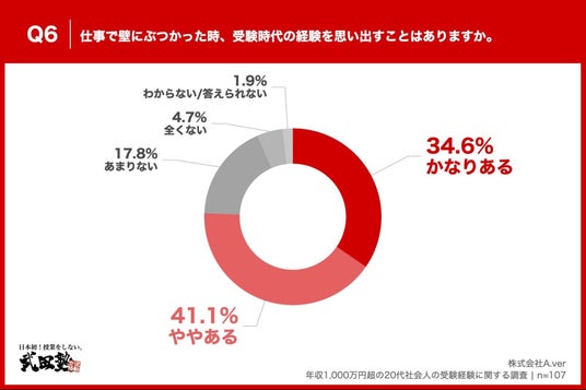 「Q6. 仕事で壁にぶつかった時、受験時代の経験を思い出すことはありますか。」(n=107)と質問したところ、「かなりある」が34.6%、「ややある」が41.1%という回答となりました。