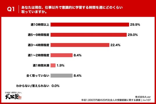 「Q1. あなたは現在、仕事以外で意識的に学習する時間を週にどのくらい取っていますか。」(n=107)と質問したところ、「週10時間以上」が29.9%、「週5~9時間程度」が29.0%という回答となりました。
