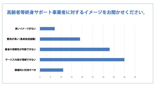 - 民間資源である「高齢者等終身サポート事業」については「サービス内容が理解できない」「業者の信頼性が判断できない」など、ネガティブなイメージや理解不足が先行。