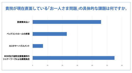- 最大の課題は「MSW及び退院支援看護師のシャドーワークによる業務負担」。次いで「医療費未払い」「ベッドコントロールの停滞」が挙げられた。