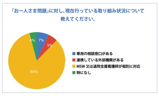 - 「お一人さま問題」への対応は、84%が「MSW又は退院支援看護師が個別に対応」しており、組織的対応や専門窓口の設置が十分に進んでいない。