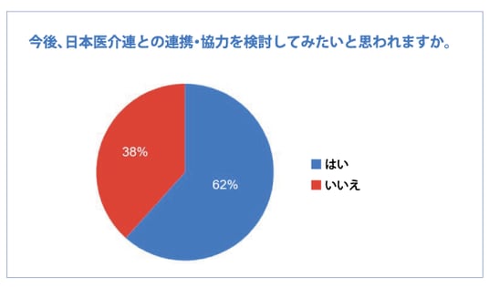 - 問題解決に向けて、今後検討したい取り組みとして最も多く挙げられたのは「専門相談先との連携」。回答施設の62%が「日本医介連との連携・協力を検討したい」と回答。