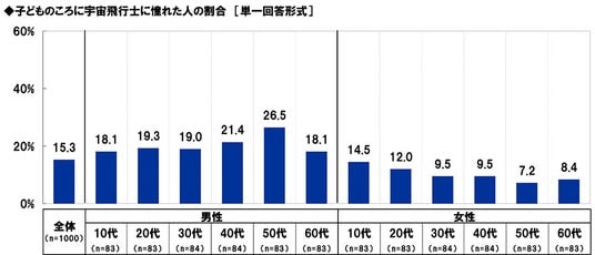 - 宇宙への憧れ 「子どものころに宇宙飛行士に憧れた」15%、50代男性では27%