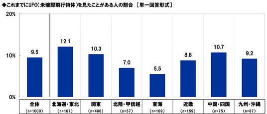 エリア別にみると、UFOを見たことがある人の割合は、北海道・東北(12.1%)、関東(10.3%)、中国・四国(10.7%)では10%を上回りました。