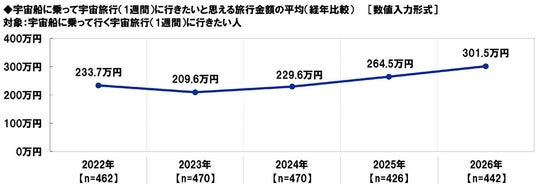 ここで、過去の調査結果(※)と比較すると、宇宙船に乗って宇宙旅行(1週間)に行きたいと思える旅行金額の平均は、2022年233.7万円→2023年209.6万円→2024年229.6万円→2025年264.5万円→2026年301.5万円と、調査開始以来はじめて300万円を突破しました。