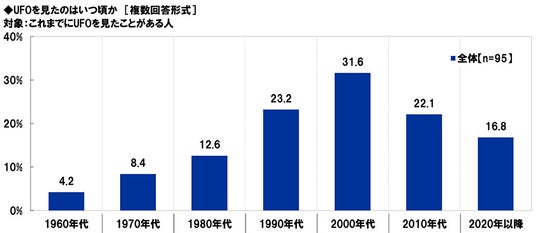 これまでにUFOを見たことがある人(95名)に、UFOを見たのはいつ頃か聞いたところ、「2000年代」(31.6%)が最も高くなり、2000年代以降は「2010年代」が22.1%、「2020年以降」が16.8%と、割合が下降する結果となりました。
