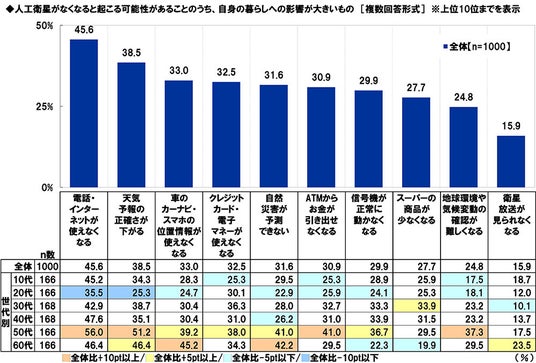 また、全回答者(1,000名)に、人工衛星がなくなると起こる可能性があることのうち、自身の暮らしへの影響が大きいものを聞いたところ、「電話・インターネットが使えなくなる」(45.6%)が最も高くなり、「天気予報の正確さが下がる」(38.5%)、「車のカーナビ・スマホの位置情報が使えなくなる」(33.0%)、「クレジットカード・電子マネーが使えなくなる」(32.5%)、「自然災害が予測できない」(31.6%)が続きました。