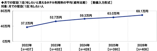 月での宿泊(1泊)をしたいと思えるホテル利用料の平均は、2022年37.2万円→2023年52.7万円→2024年59.3万円→2025年63.0万円→2026年69.1万円と調査開始以来の上昇傾向が続きました。