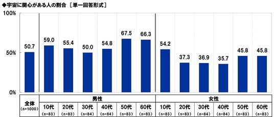 まず、全回答者(1,000名)に、宇宙に関心があるか聞いたところ、関心がある人の割合は50.7%でした。