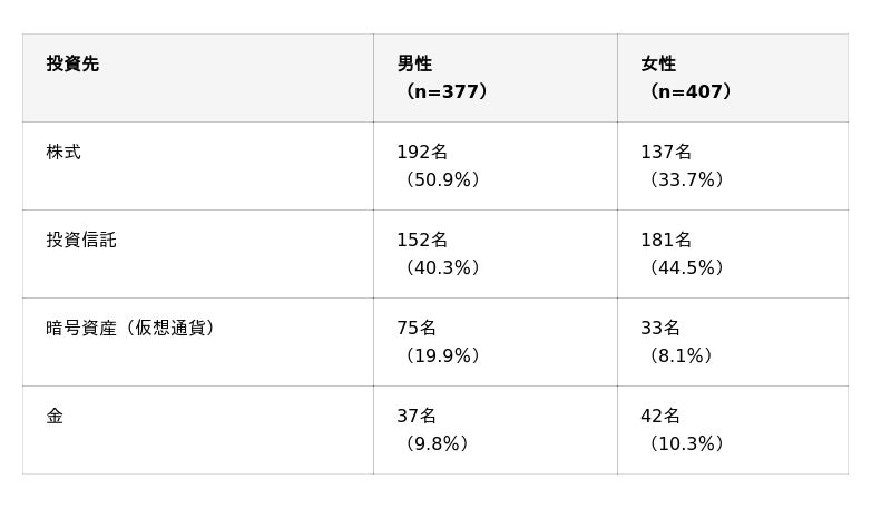 - 男女別でみると、男性は「株式」(50.9%)、女性は「投資信託」(44.5%)が最多