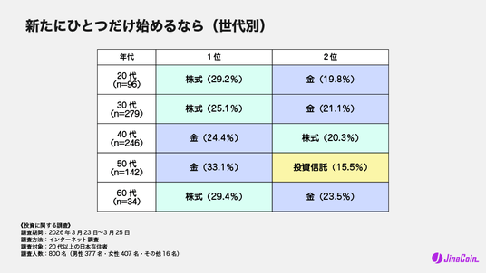 - 「新たにひとつだけ始めるなら」では、20代・30代は「株式」、40代・50代は「金」が1位