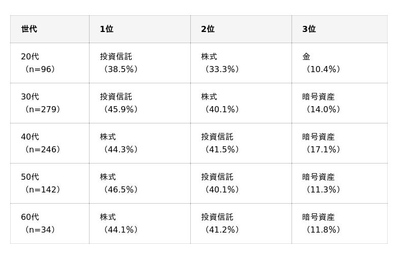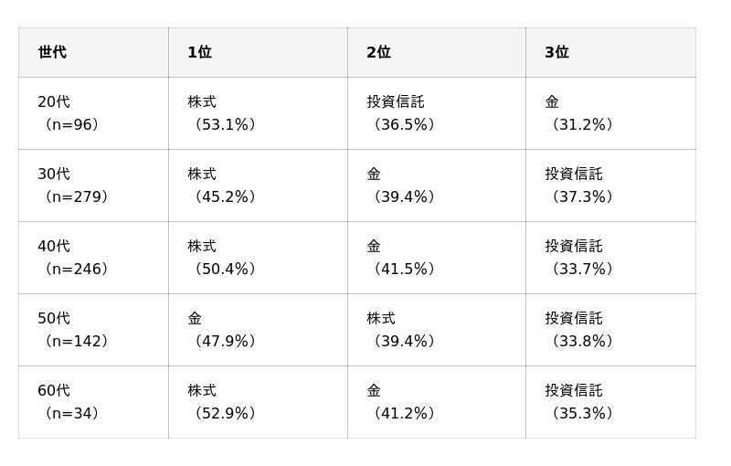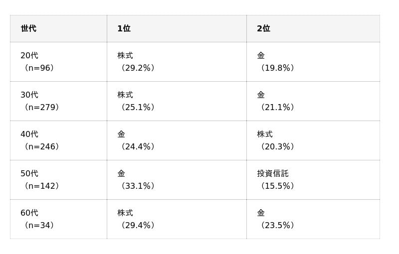 暗号資産(仮想通貨)は40代が17.1%で全世代中最も高く、30代(14.0%)がそれに続きました。20代では暗号資産に代わり金(10.4%)が3位に入っています。