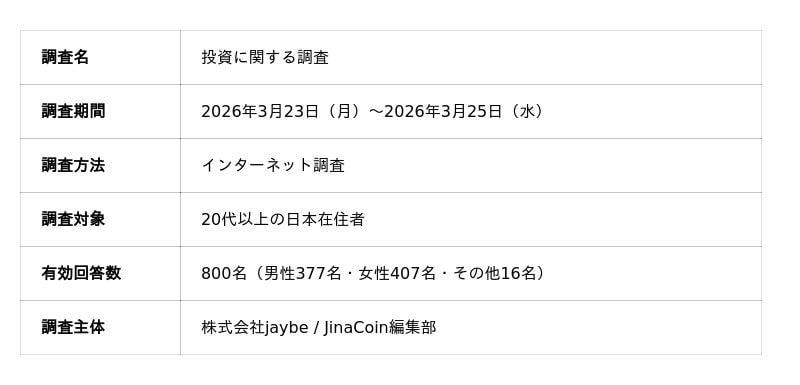 株式会社jaybe(本社:香川県高松市、代表取締役:水澤 誉往)が運営する暗号資産(仮想通貨)ニュースメディア「JinaCoin」(https://jinacoin.ne.jp/)は、20代以上の日本在住者800名を対象に、投資に関するインターネット調査を実施しました。