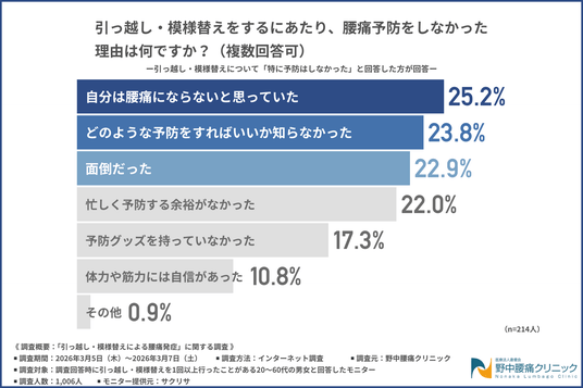 前問で腰痛予防について『特に予防はしなかった』と回答した方に、「引っ越し・模様替えをするにあたり、腰痛予防をしなかった理由」について尋ねたところ、『自分は腰痛にならないと思っていた(25.2%)』が最も多く、『どのような予防をすればいいか知らなかった(23.8%)』『面倒だった(22.9%)』と続きました。