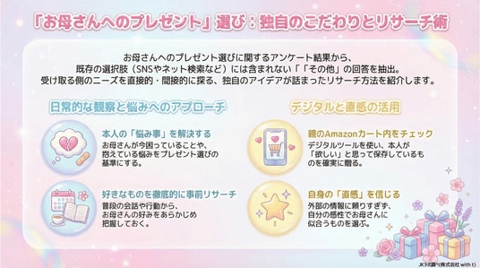 決して高価なブランド品ではなくとも、限られた予算内で「母親の悩み(美容)」や「好きなもの」を徹底リサーチし、価格以上の価値(情緒的価値)を届けている実態が見て取れます。