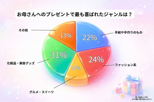 過去に贈って最も喜ばれたアイテムは、「化粧品・美容グッズ(31件)」が最多。次いで「ファッション(24件)」、そして「手紙や手作りのもの(22件)」が続きます。 実用的なセルフケア支援と、手書きのメッセージによる情緒的な感謝。この「実益×感情」の両立が、母親の心を掴む必勝パターンといえます。