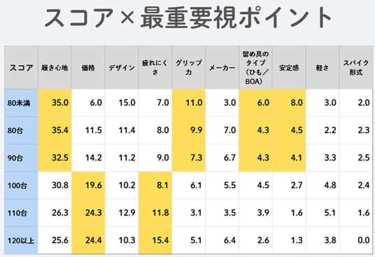 上級者層は「履き心地」や機能面を最重要視する割合が高く、初級者層に近づくほど価格や疲れにくさを重視する構造が明らかになっています。