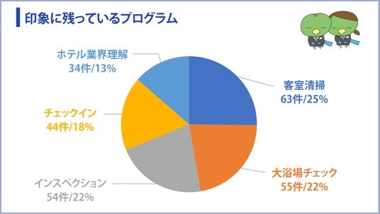「印象に残っているプログラム(複数回答)」では、フロントでの「チェックイン(44件)」を抑え、「客室清掃(63件)」や、客室の最終確認を行う「インスペクション(54件)」、さらには「大浴場チェック(55件)」といった裏方の業務が上位を占めました。普段は目にすることのない舞台裏で、お客様の快適さを守るスタッフの徹底したこだわりを間近に体感したことが、生徒たちの納得感に繋がっています。