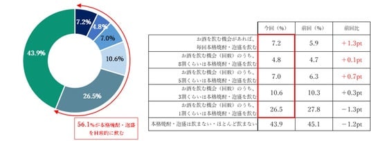 お酒を飲む機会(回数)のうち、本格焼酎・泡盛を「5割以上」飲むと回答した層は、前回比(2021年の調査)と比較してやや増加傾向で、飲用頻度の高い層が拡大しているといえます。Q.お酒を飲む機会(回数)のうち、本格焼酎・泡盛を飲む機会(回数)の割合