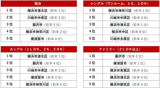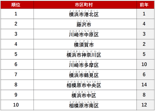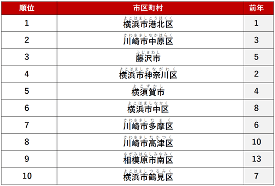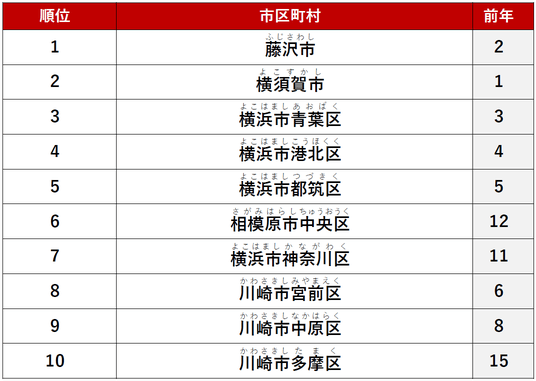 2位に「川崎市中原区」、3位に「藤沢市」がランクインしました。