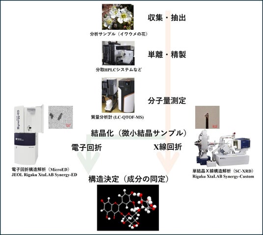 独立行政法人国立科学博物館(館長:篠田謙一) の連携大学院生の平野日向(東京農工大学 大学院連合農学研究科)、菊池貴(リガク・ホールディングスのグループ会社である株式会社リガク プロダクト本部 アプリケーションラボ)、榊原風太(アステリズム合同会社 研究開発支援事業部 技術顧問)、村井良徳(植物研究部 研究主幹)らは、微量成分分析法の開発により、植物体が小さく、許認可や倫理的な面からも研究用のサンプルの確保が難しい高山植物において10種以上のフェノール化合物配糖体の構造決定に成功しました。具体的には、イワウメ科高山植物イワウメのわずか2グラムの花から成分を単離して結晶化させ、単結晶X線構造解析(SC-XRD)や電子回折構造解析(MicroED)などの分析手法を適宜利用することにより、各含有成分を構造決定することに成功しました。高山植物を含む野生植物において、これほど微量のサンプルから多数の成分構造を決定したことは先駆的な研究例になります。これは、植物の化学成分のみならず、理学、農学、薬学など幅広い分野における未活用資源の探索研究に応用できる技術です。本研究成果は、2026年2月22日に、化学分野の国際誌「Journal of Molecular Structure」にオンライン掲載されました。さらに関連技術を用いた研究成果に関しても、生物化学分野の国際誌「Biochemical Systematics and Ecology」および農業産業分野の国内誌「アグリバイオ」に掲載されました。