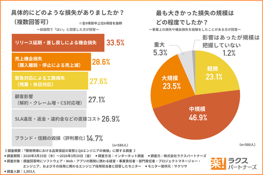 しかし、約6割の企業が直近1年間で低品質(不具合・障害・仕様不備など)による事業損失を経験しており、「リリース延期」や「売上機会損失」「工数損失」といったダメージを受けている実態が浮き彫りになりました。