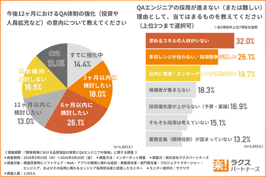 ITエンジニアの派遣・SES事業を展開する株式会社ラクスパートナーズ(東京都新宿区、代表取締役:吉田 雅行)は、ソフトウェア・Web・アプリの開発に携わる経営・事業責任者・部門責任者・プロジェクトマネージャー・エンジニア、およびその採用に携わるエンジニア採用担当者を対象に、「開発現場における品質保証の実態とQAエンジニアの価値」に関する調査を実施しました。本リリースでは一部を抜粋しお知らせいたします。