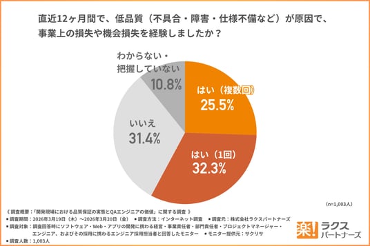 次に、「直近12ヶ月間で、低品質(不具合・障害・仕様不備など)が原因で、事業上の損失や機会損失を経験」について尋ねたところ、以下のような回答結果になりました。