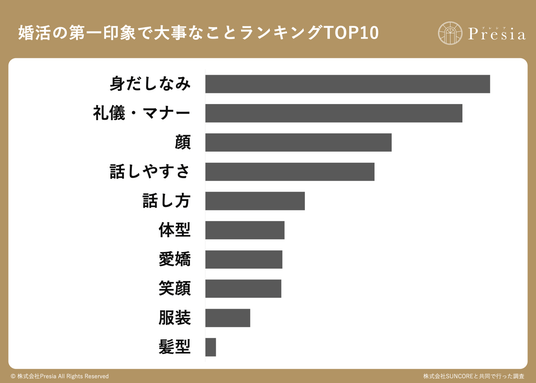 結婚相談所Presia(株式会社Presia)は、婚活経験のある20~50代の男女200名を対象に、「婚活における第一印象に関する意識調査2026」を実施しました。