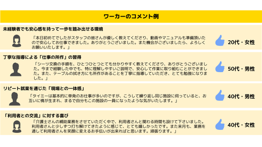 ワーカーの皆さんからは就業後、「動画やマニュアルの準備があって安心して働けた」「利用者との交流が嬉しかった」といったコメントもいただいています。無資格・未経験者が介護の仕事に無理無く従事できていることが窺えます。