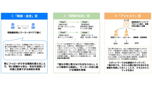 動画と紙マニュアルを活用する「段階的自走型」や、職員とペアで動く「隣接・並走型」、ワーカーの能力に応じて業務を割り振る「アジャスト型」などの受け入れ手法が確立され、初回稼働から円滑な導入が可能であることが実証されました。