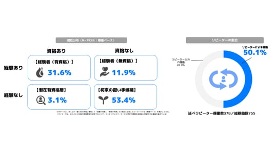 本事業でマッチングしたワーカーの53.4%(2人に1人)が無資格かつ介護未経験者となり、業界外の新たな人材層の裾野拡大に成功しました 。接点創出後のリピーター化も活発で、実証事業所の83.3%がリピーターの受け入れを行いました 。全稼働に占めるリピーター割合も50.1%に達し、単発で終わらない継続的な関わりが生まれています。