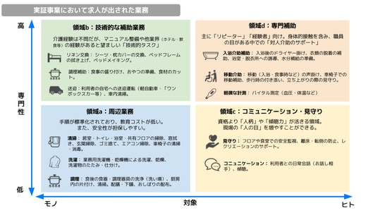 スポットワークで行う業務を「周辺業務」「技術的な補助業務」「コミュニケーション・見守り」「専門補助」の4領域に分類するとともに、その中でもスポットワーカーと親和性が高い業務を可視化。業務をタスクレベルに切り出すことで、ホテル清掃や飲食店など他業種での経験を持つワーカーが即戦力として活躍。実証ワーカーの約6割が他業種をメインとする層であり、さらに約76%が、本実証で初めてタイミーのプラットフォーム上での介護分野への就業を実現するなど、他分野・他職種からの「労働移動」が実現しました。