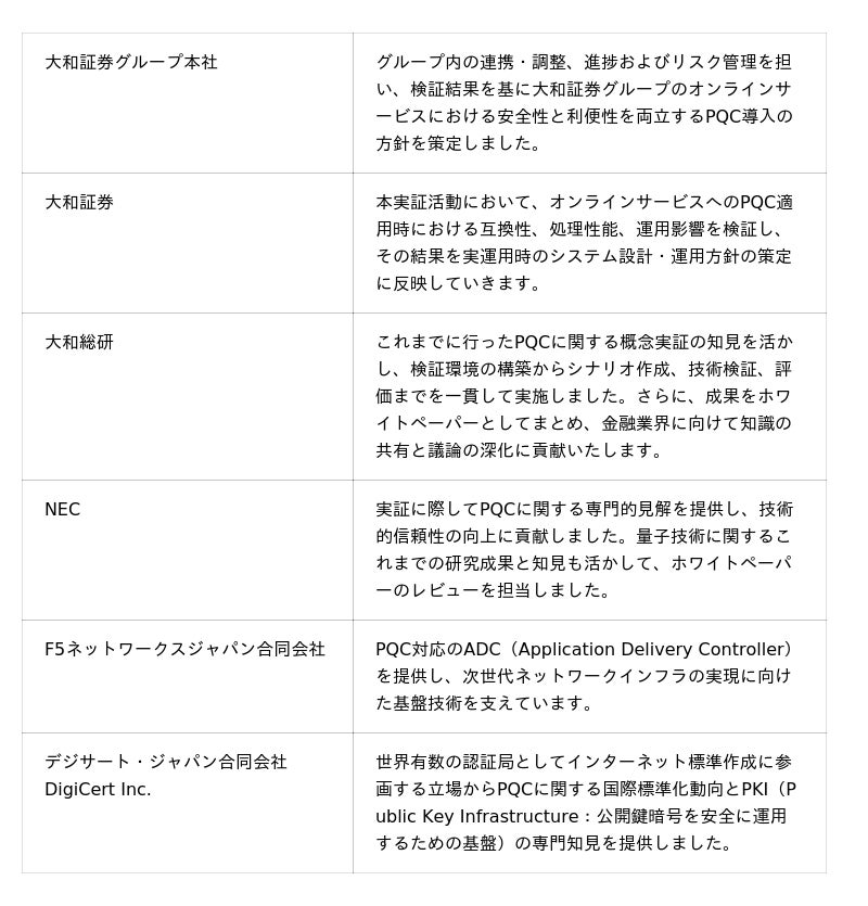 株式会社大和証券グループ本社(以下「大和証券グループ本社」)傘下の大和証券株式会社(以下「大和証券」)、株式会社大和総研(以下「大和総研」)は、日本電気株式会社(以下「NEC」)、F5ネットワークスジャパン合同会社(以下「F5ネットワークス」)およびデジサート・ジャパン合同会社(以下「デジサート」)と協働し、量子コンピュータ時代に備えた耐量子計算機暗号 (Post-Quantum Cryptography、以下「PQC」)技術の概念実証(以下「実証」)について、その結果を公表いたします。