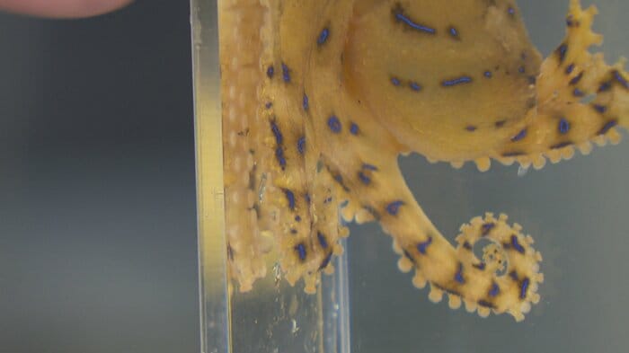 先月23日に富山県射水市の海岸で発見されたヒョウモンダコ。全長は約10センチで普段は茶褐色の体ですが、水槽に指を近づけると、一瞬で黄色と青の鮮やかな模様に変わります。