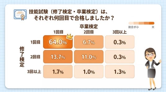 ・技能・学科試験ともに約65%が1回で合格している。
