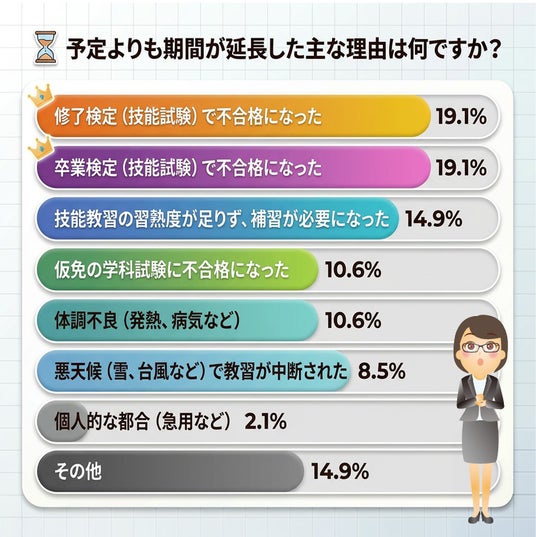 ・延長の主因は「技能試験(卒業・修了検定)の不合格」(各19.1%)が最多。