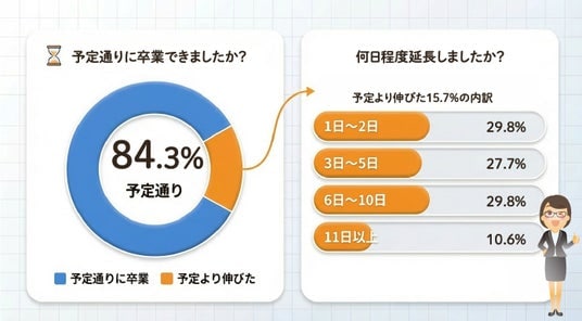 予定より卒業が延びた人(15.7%)の内訳を見ると、「1~2日」と「6~10日」が共に29.8%、「3~5日」が27.7%となりました。 延長日数は人それぞれですが、多くの場合は10日以内の延長で卒業できている実態が伺えます。