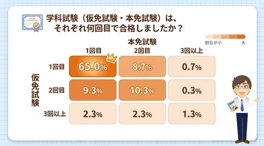 4. 試験の合格回数:約65%が技能・学科ともにストレート合格