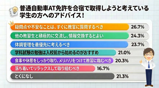 今回の調査結果から、合宿免許の卒業期間は単なる運ではなく、事前の学習や体調管理、不明点を放置しない積極的な姿勢によって左右されることが明らかになりました。 これから合宿免許に参加される方は、今回の結果を参考に、落ち着いて教習に臨める準備を整えることが最短卒業への近道となります。